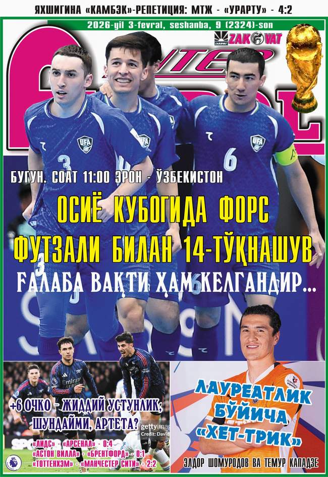 Футзалчиларимизни навбатдаги жиддий синов кутмоқда – Эрон билан 14-тўқнашув. Хўш, ғалаба вакти келдими? Бу саволга бугунги учрашув орқали жавоб оламиз. Турли ёшдаги термаларимиз ва клубларимиз ҳам йиғинларни давом эттиришмоқда.  Айтганча, ўтган ҳафтада Элдор Шомуродов ва Темур Кападзеда эса лауреатлик бўйича «хет-трик»га эришишди. Хуллас, газетамизнинг 3 январь кунги сонида ТОП-5 чемпионатлардаги қизғин кураш ҳамда бошқа шу каби қизиқарли хабарларни ўзида мужассам қилган қатор мақолалар чоп этилди. Хусусан…