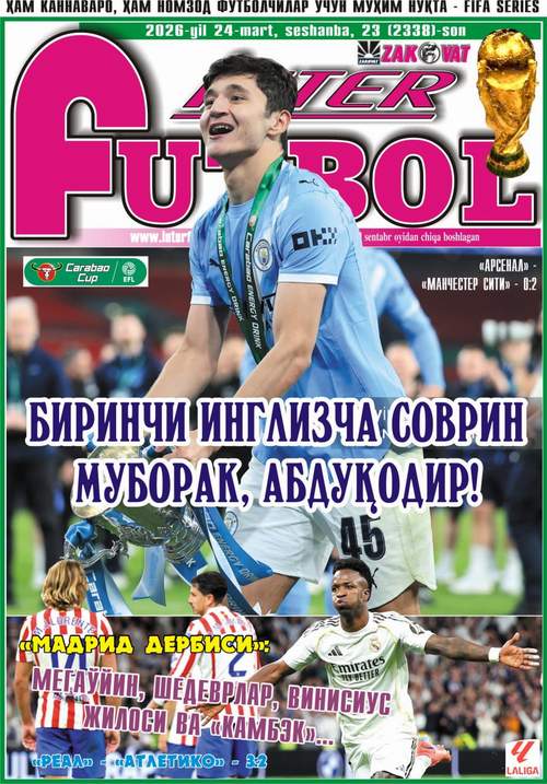 Cир эмас, миллий термамиз ҳимоячиси Ҳусанов ва «Сити»  якшанба куни Англия Лига кубоги финалида АПЛ пешқадами – «Арсенал»ни енгиб, турнирда 9-марта зафар қучди. Зотан, шу тарихий воқеа билан ҳамоҳанг бош жамоамиз Тошкентда бўлиб ўтадиган FIFA Series турнирига тайёргарликни бошлади. ТОП-5 лигалари айниқса Ла Лигада интрига ҳамон “ўлганича” йўқ. Газетамизнинг 24 март кунги сонида шу ва бошқа мавзулардаги эксклюзив мақолалар танишишингиз мумкин. Жумладан…