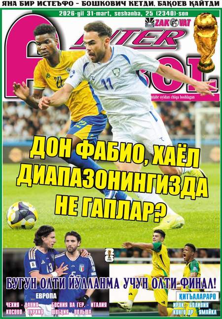 Хабарингиз бор, Тошкент мезбонлик қилган нуфузли FIFA Series баҳслари доирасида Габон ва Венесуэла термаларини мағлуб этган миллий терма жамоамиз мусобақа ғолиблигини қўлга киритди. Ушбу учрашувлар орқали бош жамоамиз устози Фабио Каннаваро тактик ечимлар ва оптимал таркиб борасида муайян хулосага келиб олган бўлса ажаб эмас. Шунингдек, бугун жаҳон чемпионатига йўлланма оладиган сўнгги олти терма жамоа номи маълум бўлади. Қисқаси газетамизнинг сешанба кунги сонида одатдагидек сизларни бефарқ қолдирмайдиган долзарб мавзулар, чуқур таҳлиллар ва эксклюзив материаллар чоп олган. Хусусан…