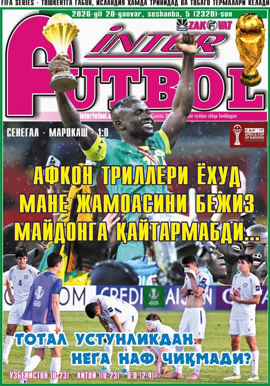 Афсуски, ёшларимиз тотал устунликга эришган бўлсаларда Хитой дарвозаси томон “йўл” топа олмадилар ва…Африка кубогида Сенегал бош совринга эга чиқққан бўлса Европа ТОП лигаларида кутилмаган натижалар қайд этилиши табиий ҳолга айланиб қолди. Шундан бўлса керак, “ИнтерФУТБОЛ”нинг 20 янқварь кунги сонида Сиз азизларга манзур бўладиган қатор эксклюзив мақолаларни ўқишингиз мумкин бўлади. Хусусан,…