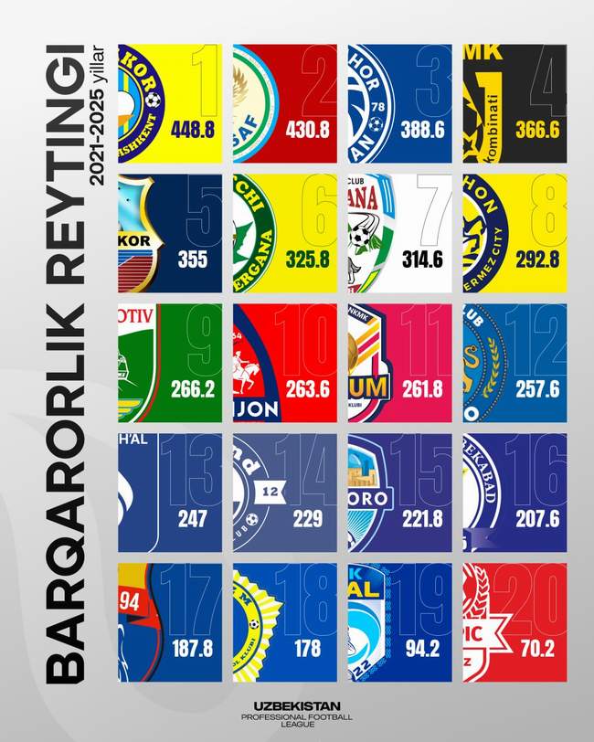 Маълумот учун, сўнгги беш йиллик натижалари 2026-йилги мавсум сўнгида яна ҳисоб-китоб қилинади. Бунда 2021-йилги мавсум натижалари айириб ташланади ва ҳисоблаш 2022-йилги мавсумдан бошланади.