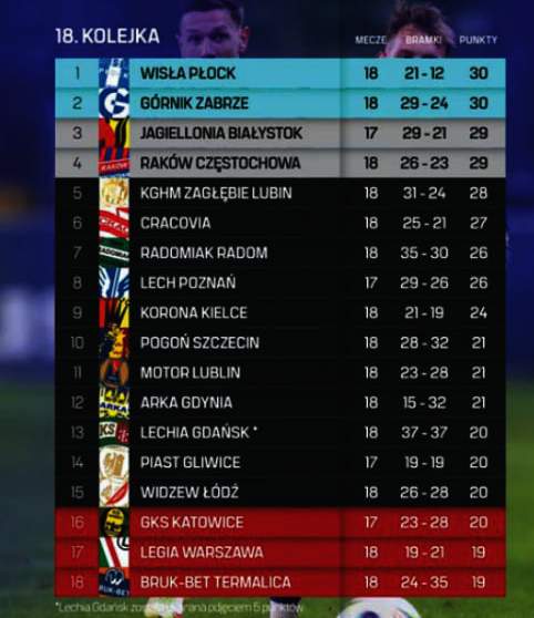Бу ҳозирги мавсум Экстракласа учун қанчалик аномал ҳисобланишини кўрсатади. Ҳозир «Висла»ни хавфли ҳудуддан атиги 10 очко ажратиб турибди, охирги ўриндан эса бир очко кўп.